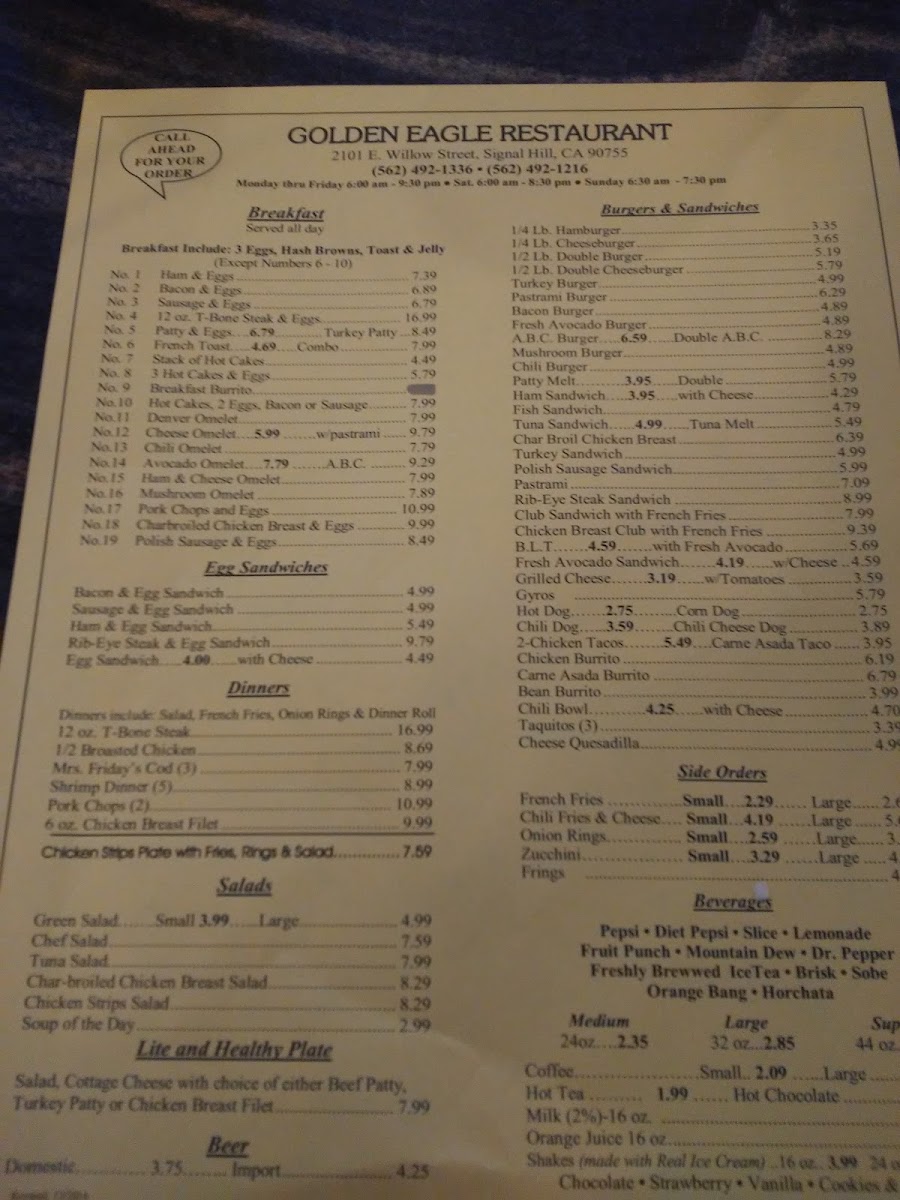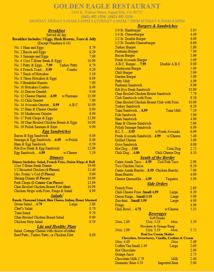 Welcome to the Golden Eagle Restaurant, a hidden gem nestled in the heart of Signal Hill, California. Located conveniently at 2101 E Willow St, this cozy diner offers a rich menu designed to satisfy every palate, from hearty breakfast burritos to indulgent burgers.