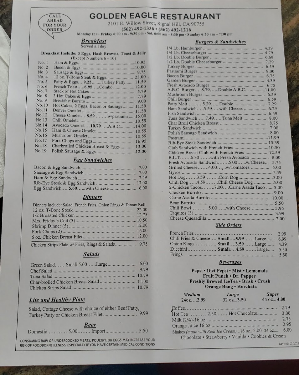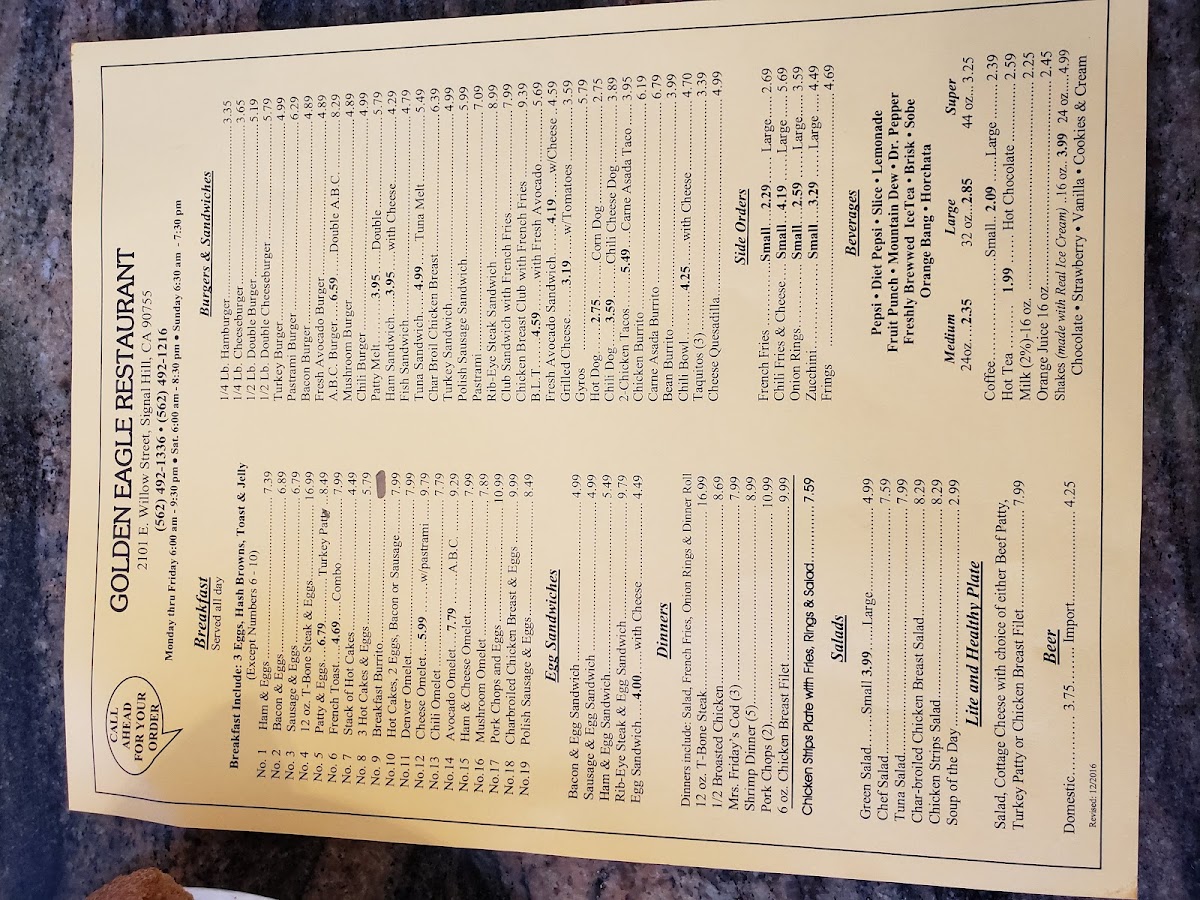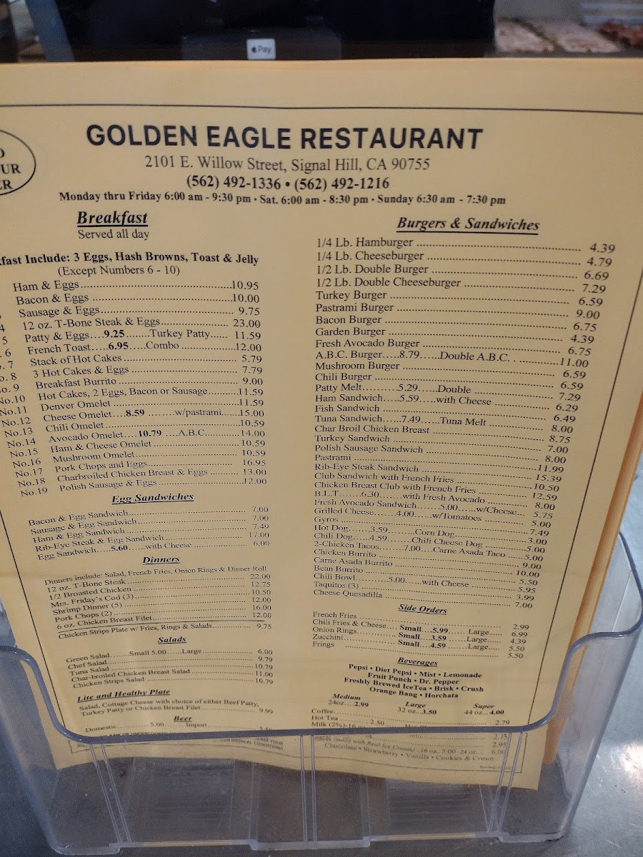 In conclusion, the Golden Eagle Restaurant offers a diverse menu, delivering both taste and value. It's a place where breakfast dreams come true, and where comfort food reigns supreme. If you find yourself in Signal Hill, swing by and discover why so many are flocking to this charming eatery. You won't regret it!